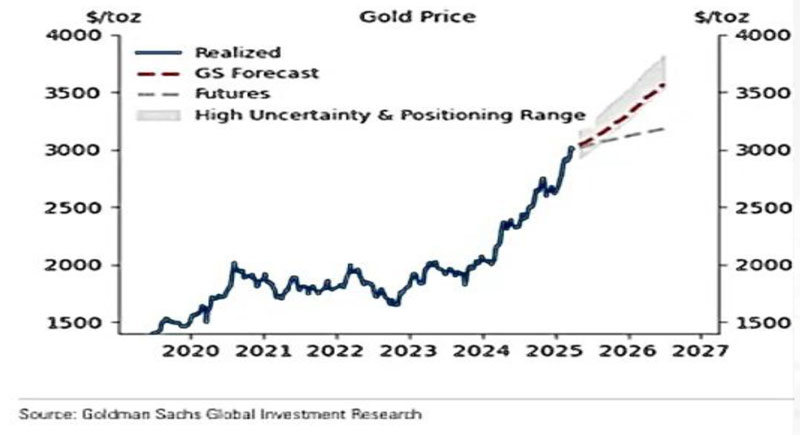- Goldman Sachs says: We raise our end-2025 forecast to $3,300/oz (vs. $3,100) and our forecast rangeto $3,250-3,520, In extreme tail scenarios gold could plausibly trade above $4,200/oz by end-2025 and exceed$4,500/oz within the next 12 months.